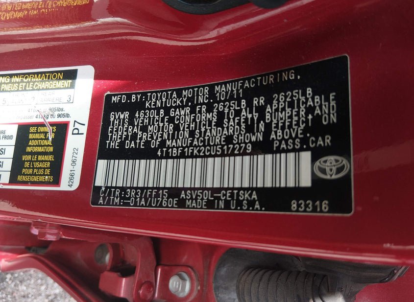 - VIN: 4T1BF1FK2CU517279