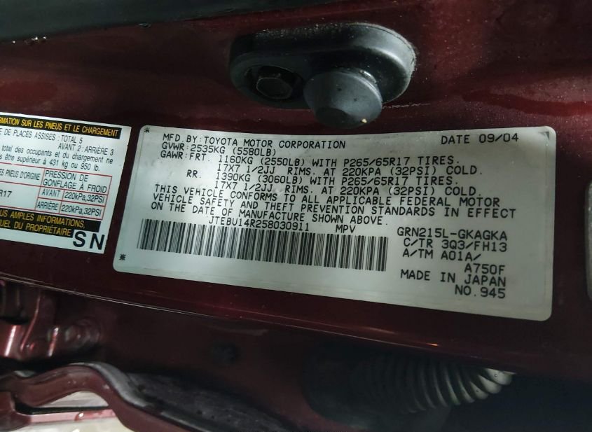 - VIN: JTEBU14R258030911