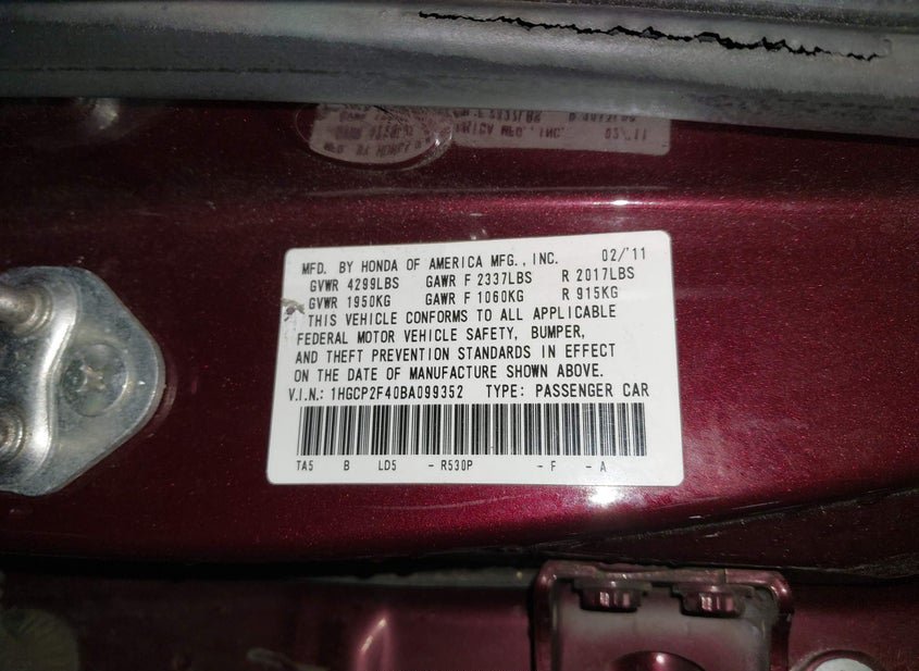 - VIN: 1HGCP2F40BA099352