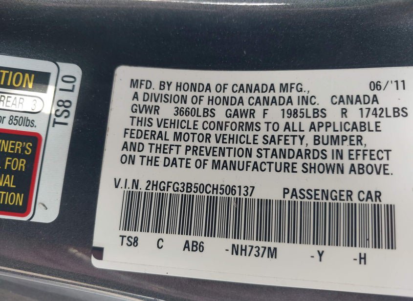 - VIN: 2HGFG3B50CH506137