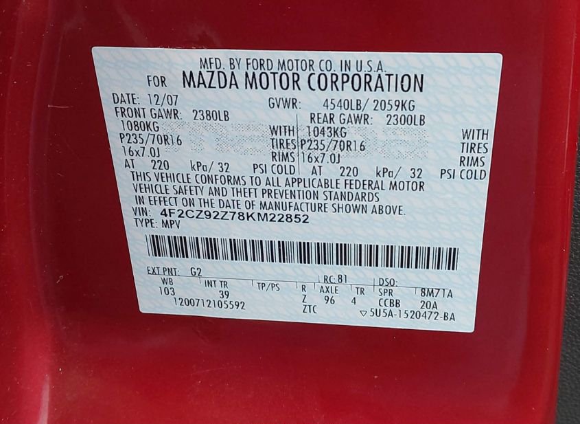 - VIN: 4F2CZ92Z78KM22852