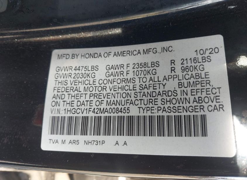 - VIN: 1HGCV1F42MA008455