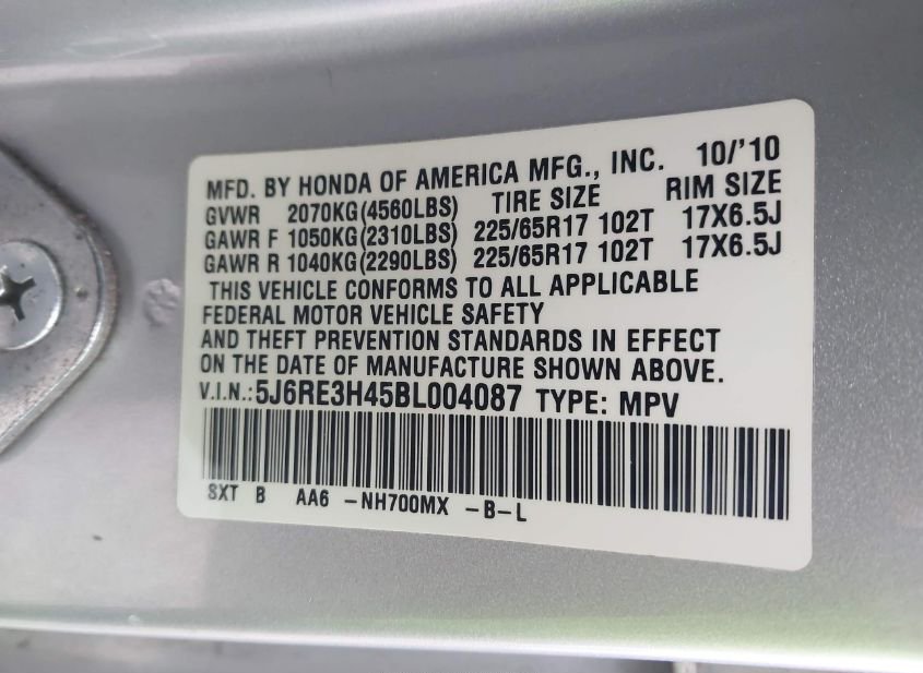 - VIN: 5J6RE3H45BL004087