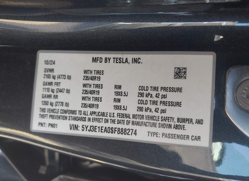 - VIN: 5YJ3E1EA0SF888274