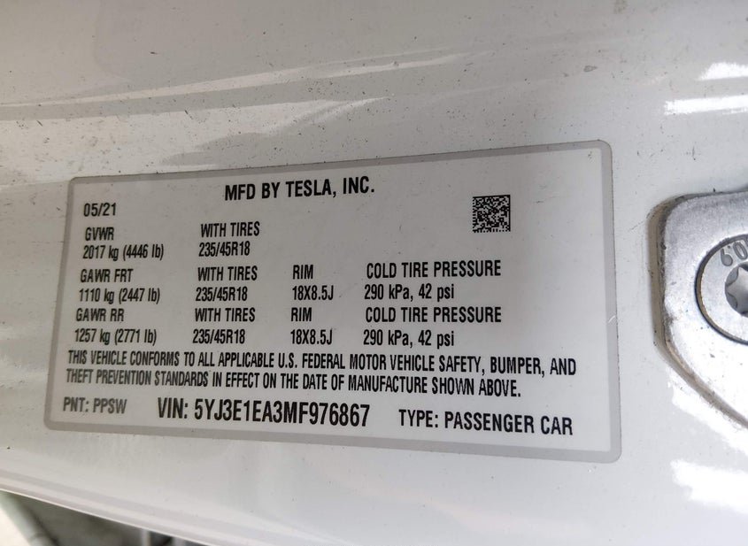 - VIN: 5YJ3E1EA3MF976867
