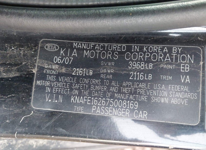 - VIN: KNAFE162675008169