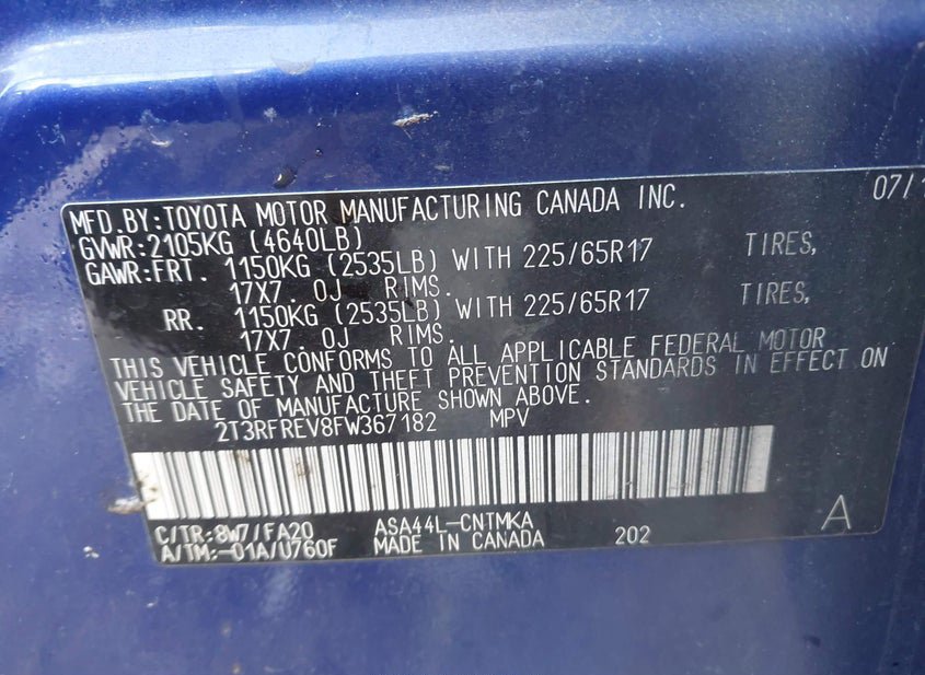 - VIN: 2T3RFREV8FW367182