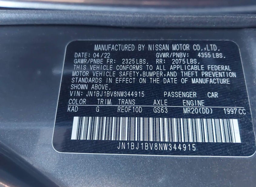 - VIN: JN1BJ1BV8NW344915