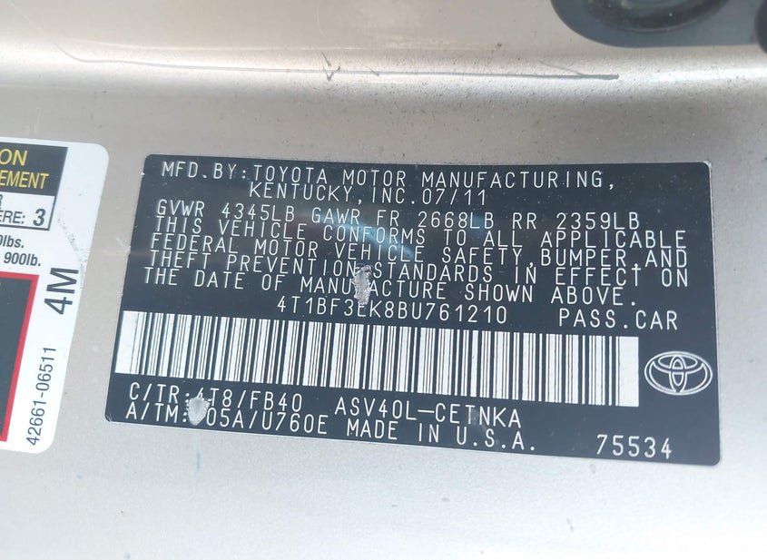 - VIN: 4T1BF3EK8BU761210