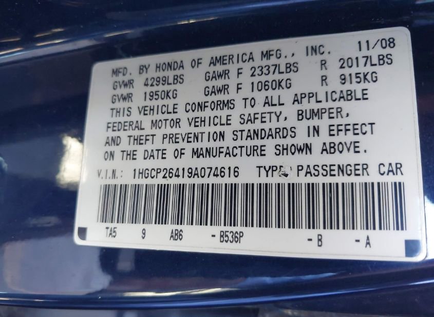 - VIN: 1HGCP26419A074616