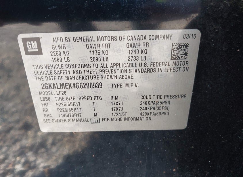 - VIN: 2GKALMEK4G6290939