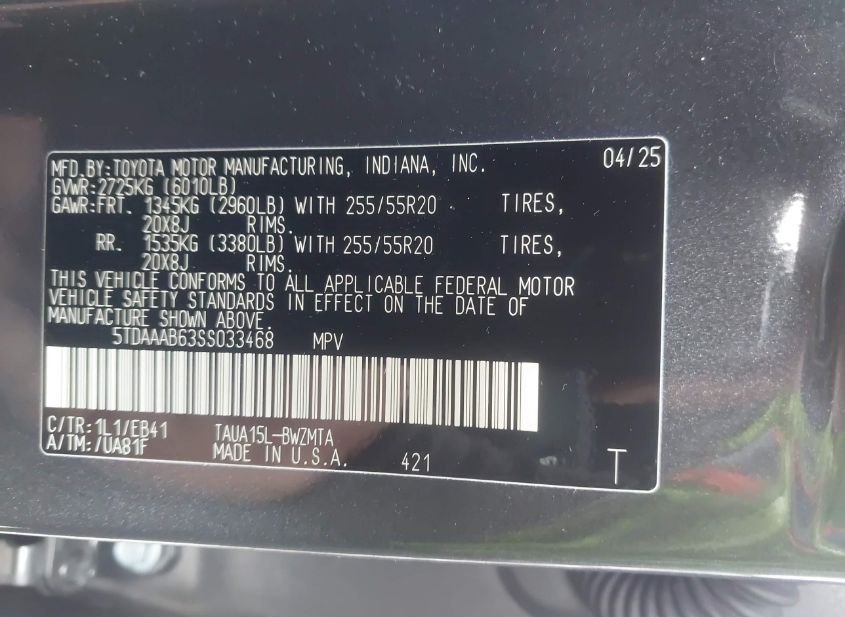 - VIN: 5TDAAAB63SS033468
