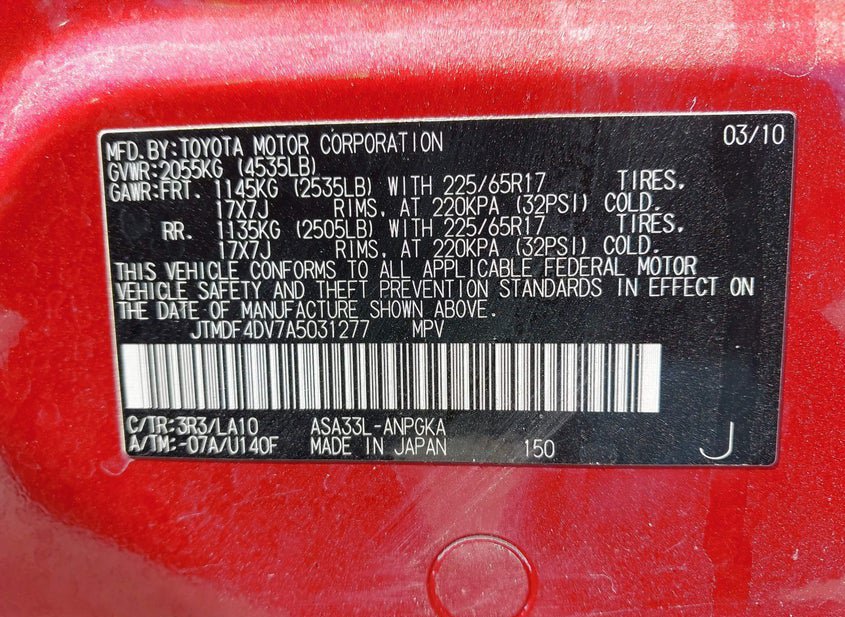 - VIN: JTMDF4DV7A5031277