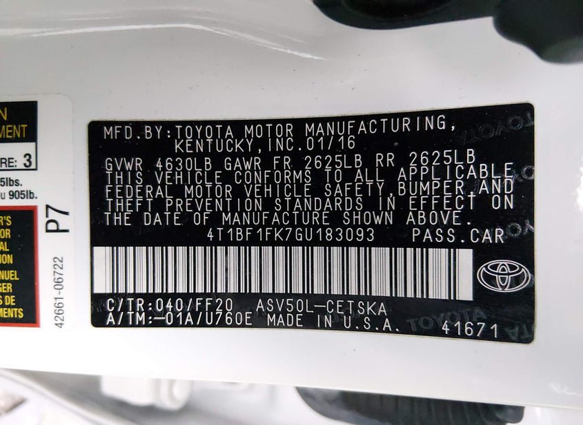 - VIN: 4T1BF1FK7GU183093