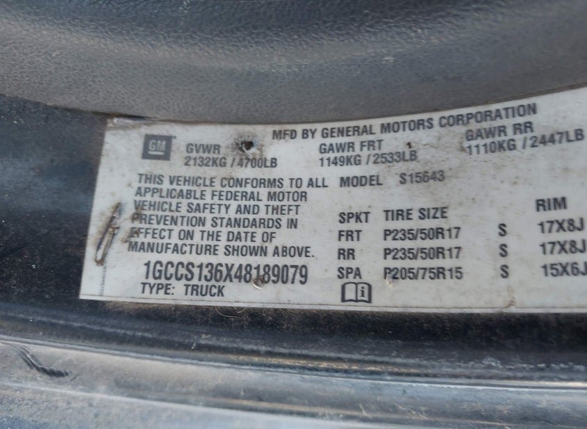 - VIN: 1GCCS136X48189079