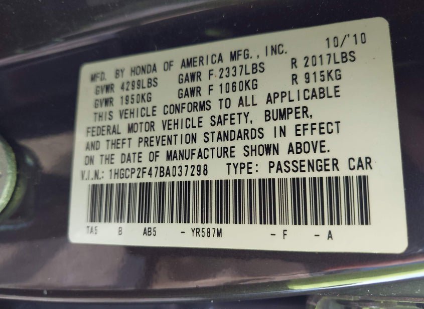 - VIN: 1HGCP2F47BA037298