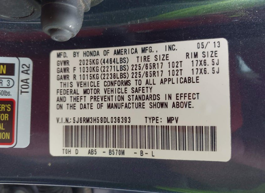 - VIN: 5J6RM3H59DL036393