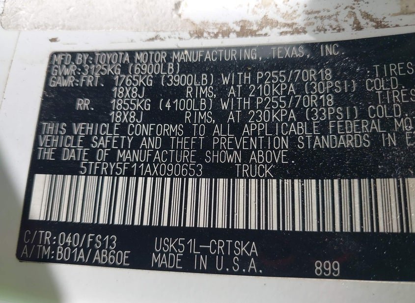 - VIN: 5TFRY5F11AX090653