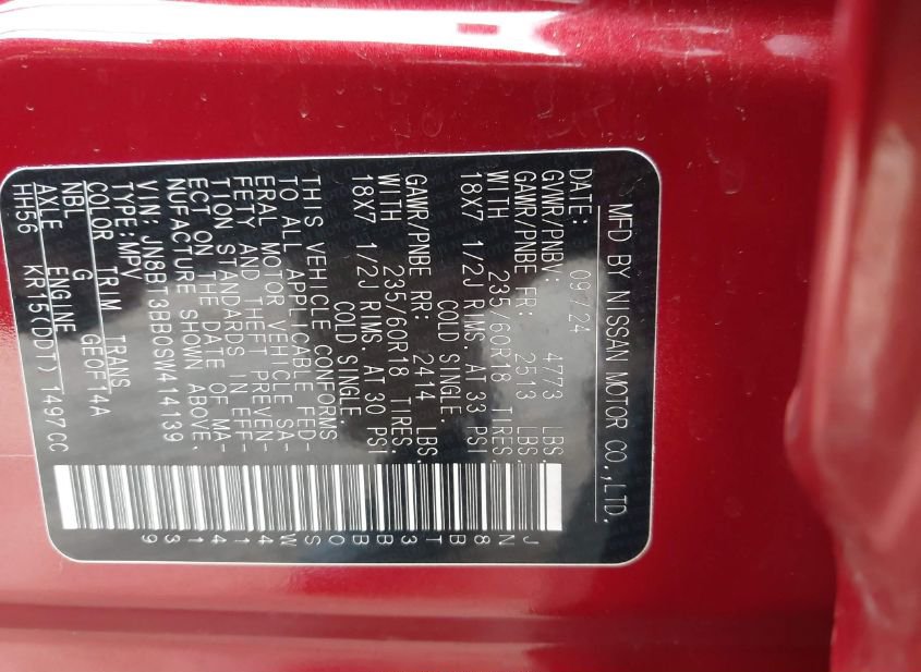 - VIN: JN8BT3BB0SW414139