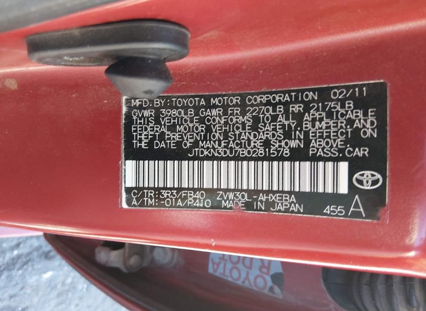 - VIN: JTDKN3DU7B0281578
