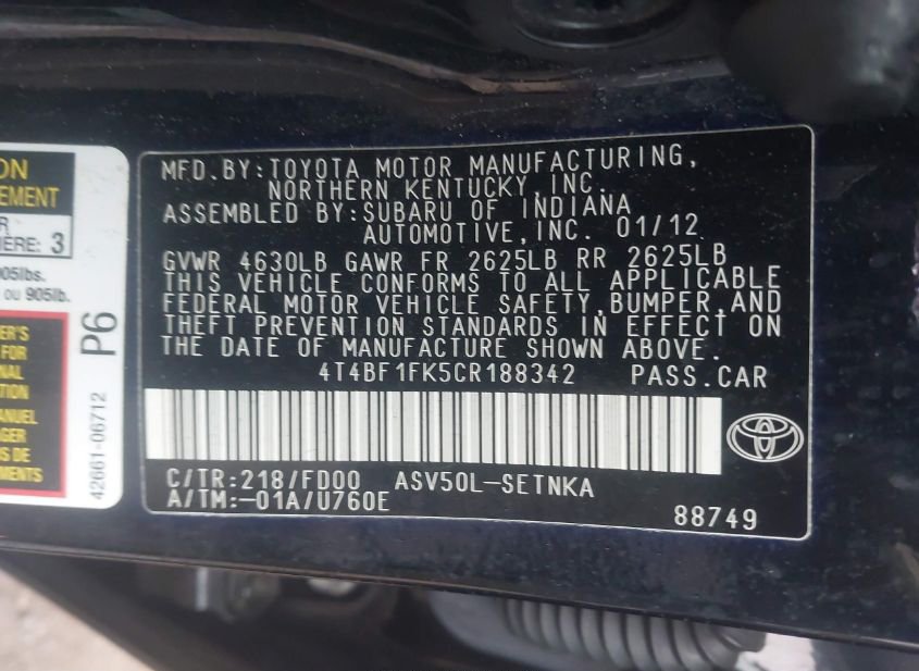- VIN: 4T4BF1FK5CR188342