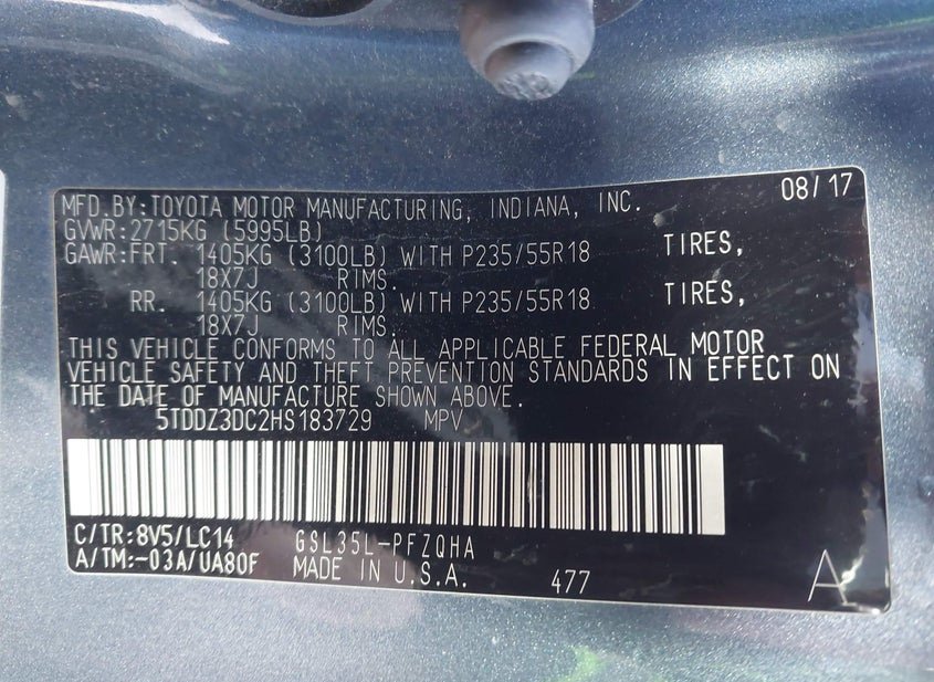 - VIN: 5TDDZ3DC2HS183729