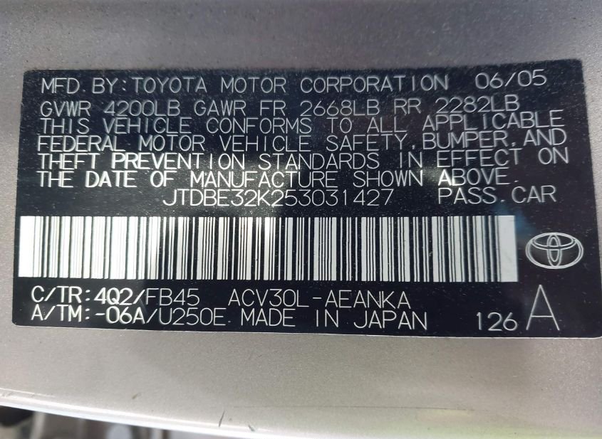 - Название лота: 2005 TOYOTA CAMRY LE