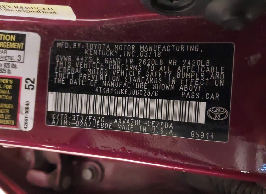 - VIN: 4T1B11HK6JU602876