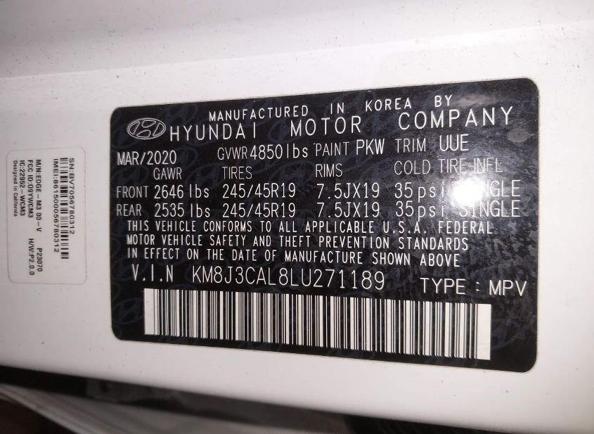 - VIN: KM8J3CAL8LU271189