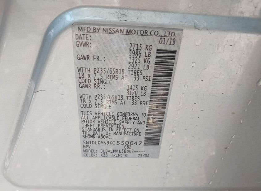 - VIN: 5N1DL0MN9KC550647