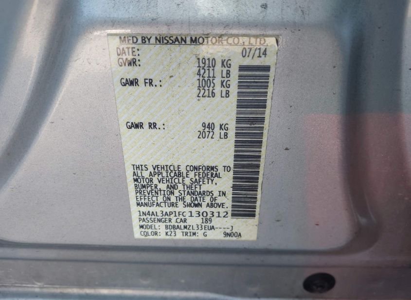 - Название лота: 2015 NISSAN ALTIMA 2.5 SV