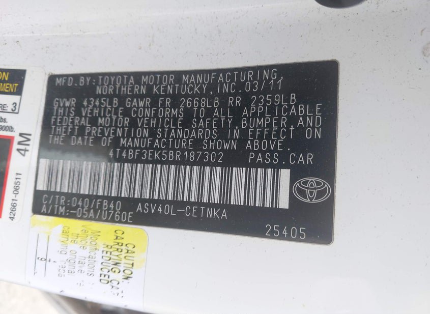 - VIN: 4T4BF3EK5BR187302