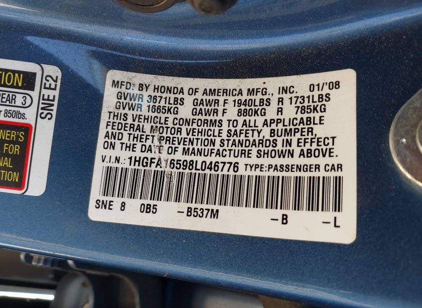 - VIN: 1HGFA16598L046776