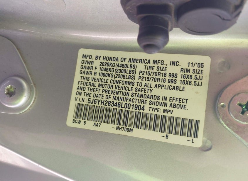 - VIN: 5J6YH28346L001904