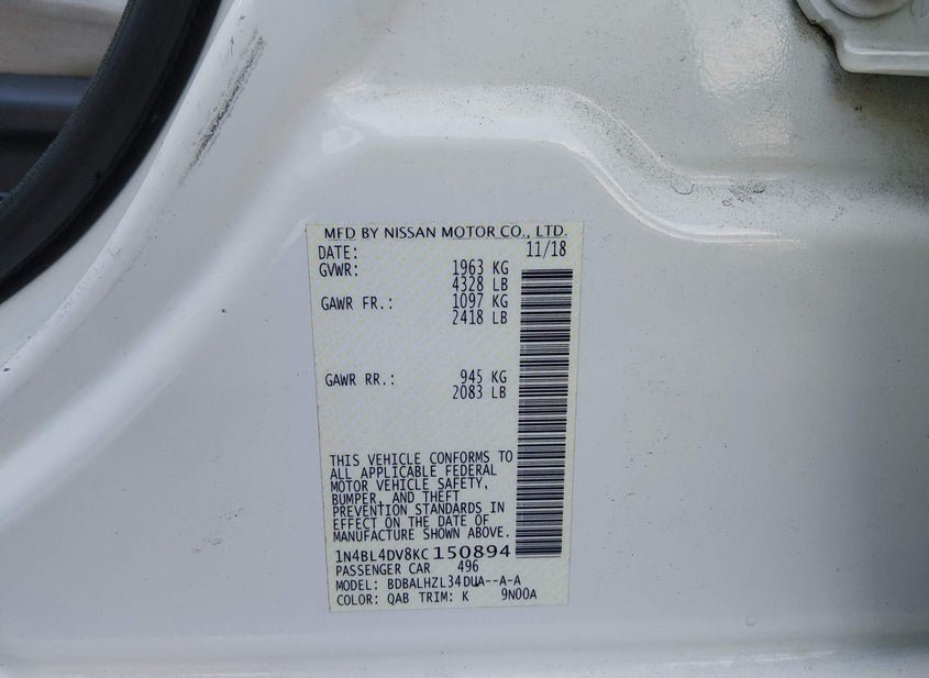 - VIN: 1N4BL4DV8KC150894