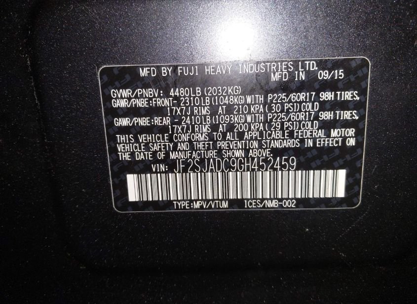 - VIN: JF2SJADC9GH452459