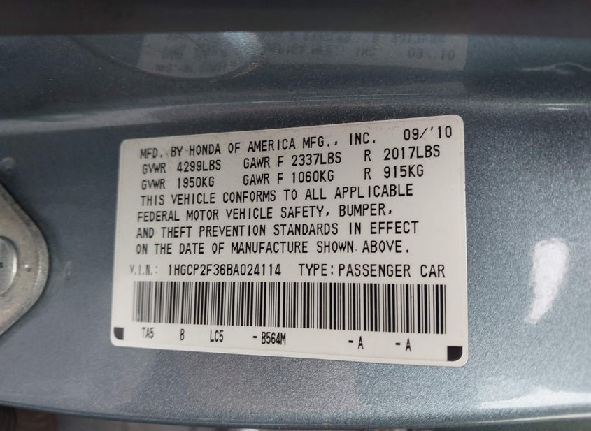 - VIN: 1HGCP2F36BA024114