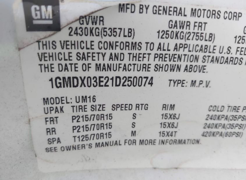 - VIN: 1GMDX03E21D250074