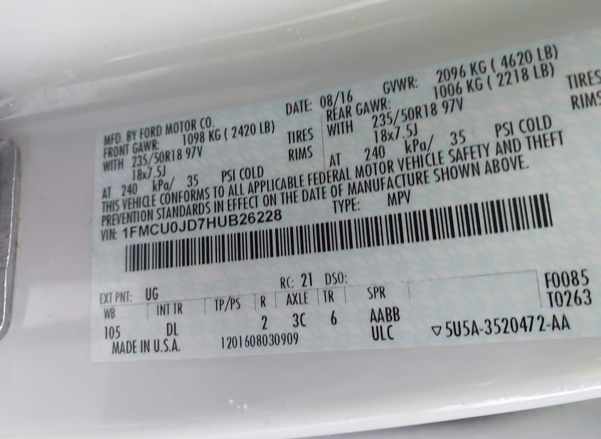 - VIN: 1FMCU0JD7HUB26228