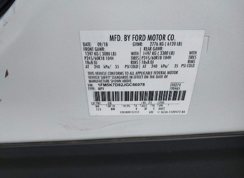 - VIN: 1FM5K7D82JGC86978
