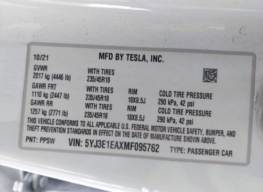 - VIN: 5YJ3E1EAXMF095762