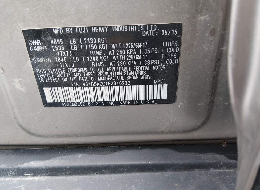 - Название лота: 2015 SUBARU OUTBACK 2.5I PREMIUM