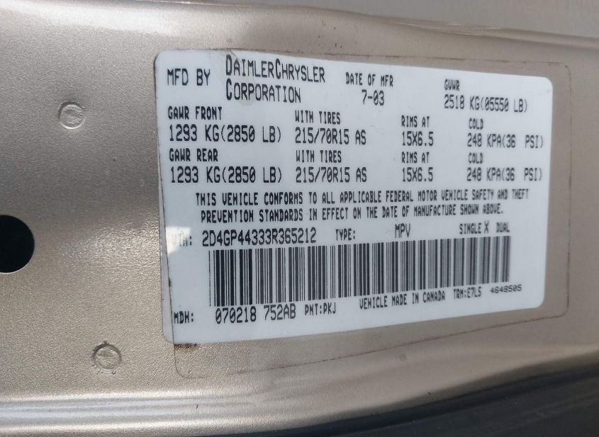 - VIN: 2D4GP44333R365212