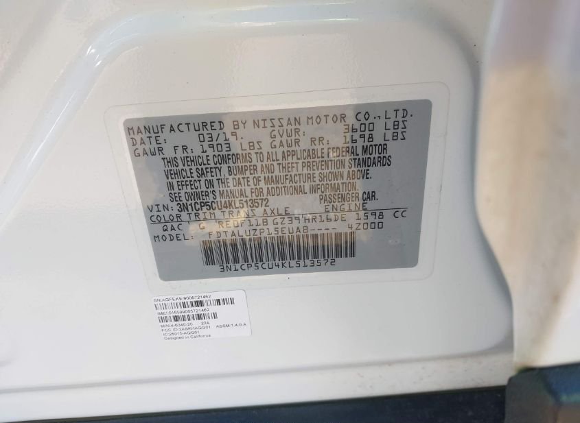 - VIN: 3N1CP5CU4KL513572