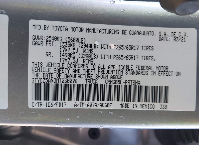 - VIN: 3TYCZ5AN3MT030076
