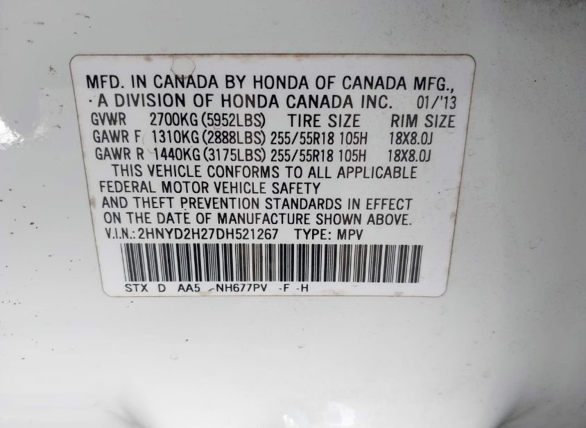 - VIN: 2HNYD2H27DH521267