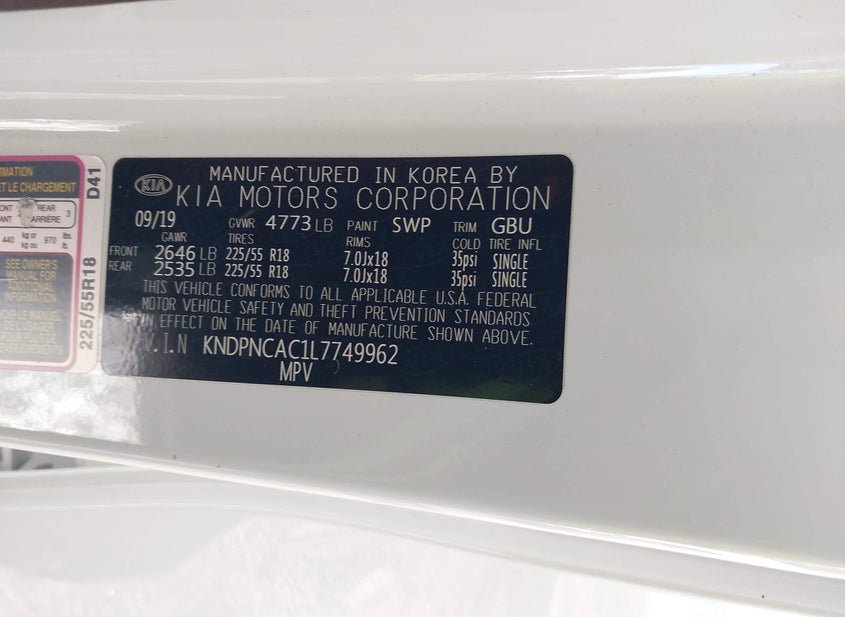 - VIN: KNDPNCAC1L7749962