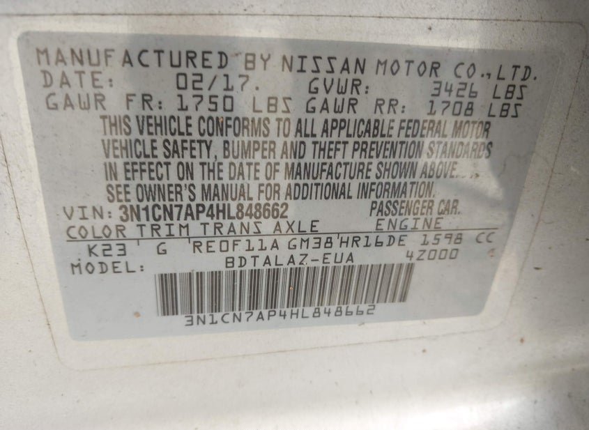 - VIN: 3N1CN7AP4HL848662