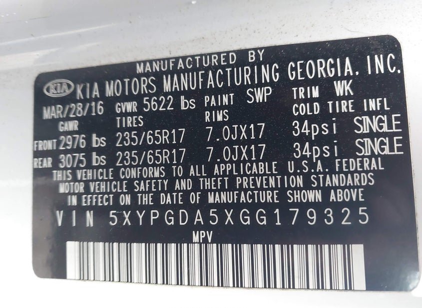 - VIN: 5XYPGDA5XGG179325
