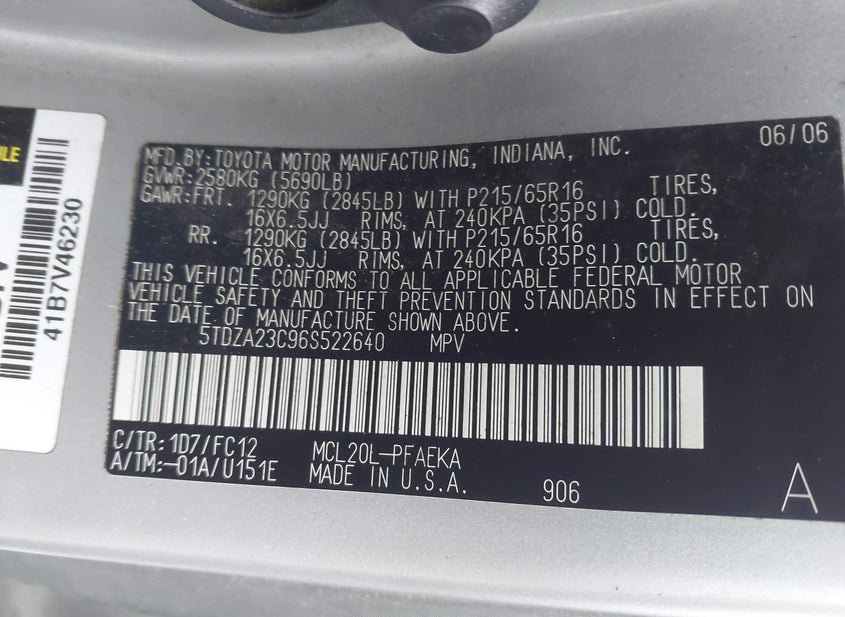 - Название лота: 2006 TOYOTA SIENNA LE